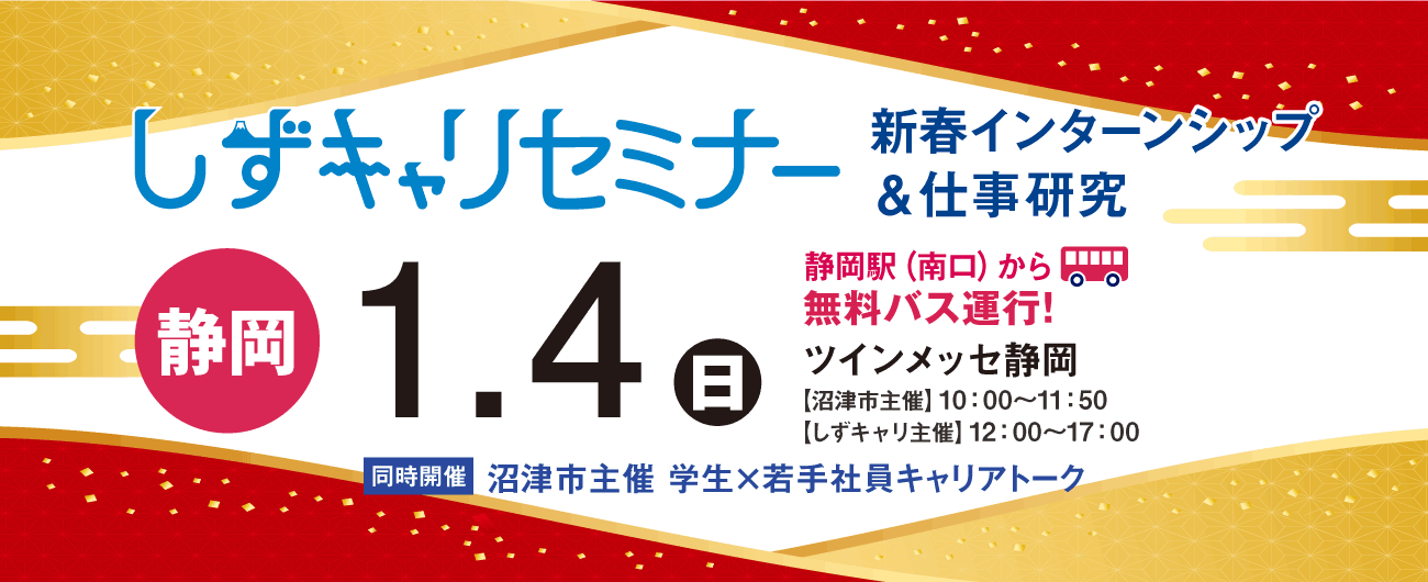 ※イベント予約ページの「ミニセミナー日程」より「沼津市主催 学生×若手社員ぶっちゃけキャリアトーク」にチェックを入れてイベント予約をしてください。しずキャリセミナー 新春インターンシップ&仕事研究も同時に予約されます。