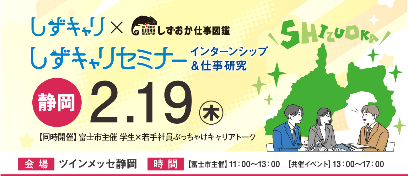 ※イベント予約ページの「ミニセミナー日程」より「冨士市主催 学生×若手社員ぶっちゃけキャリアトーク」にチェックを入れてイベント予約をしてください。しずキャリセミナー 新春インターンシップ&仕事研究も同時に予約されます。